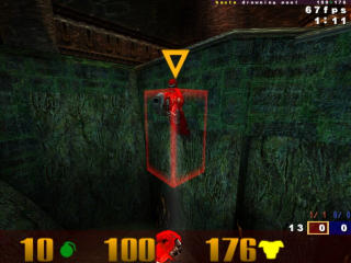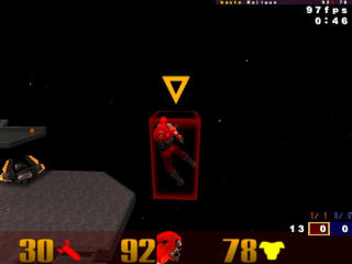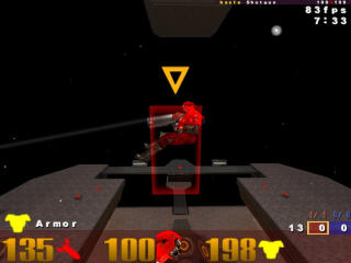 The pictures on the right are taken in third-person with cg_drawBBox set to 1. This is a cheat-protected option in Unlagged that draws player bounding boxes. A bounding box is basically the hit zone. Every player's bounding box, regardless of which model they use, is exactly the same size. What varies between player models is how representative the player model is of the bounding box. I took the pictures with Bitterman, the model I use. Picture 1 shows Bitterman standing in one place. The bounding box representation of him is alright – it's just got empty spaces up both of his sides because he's sort of thin. Hitting one of those empty sides would definitely look like a false hit. Picture 2 shows Bitterman in exactly the same spot, but rotated 45 degrees. Notice that his bounding box did not rotate with him. That's not a bug in the cg_drawBBox code – that's actually the way Quake 3 does bounding boxes. It's the “axial” part: they are always in the same orientation in relation to the map. (“Axial,” incidentally, means “along an axis” – like all 12 edges of the bounding box.) At ground level, it's about 1.4 times easier to hit a player if you're at a 45-degree angle to him in relation to the map. If you're up about 22 degrees, it's about 1.6 times easier. Yeah, so Quake 3 without lag compensation is the ultimate in consistency, right? No – but that's what I hear from a lot of Unlagged naysayers. (Please excuse my bitter attitude toward people who refuse to understand things.) Picture 3 shows Bitterman flying forward. This is also what it looks like when a player is strafe-jumping. Right: he's forward in the bounding box, leaving the back half empty. This is where a lot of “you can shoot behind people and still hit them” accusations come from. Picture 4 is Bitterman flying sideways. Notice the empty space in the corners. Picture 5 is Bitterman flying backward. Notice the big, fat empty space at the bottom. My very favorite, though, has got to be Picture 6. It's Bitterman doing a standing jump. Granted, most player models don't have this problem with a standing jump (though all have it at least a little bit), but it illustrates how bad things can get. Bitterman's player model, when jumping, as this picture shows, can generate both a false hit and a false miss. The next two, however, happen to the same degree with every player model. Picture 7 shows Bitterman just after he hit one of the bouncepads by the railgun in q3dm17. Notice that he's almost completely outside of his bounding box. Right: you can hit all that empty space and still hit Bitterman, or you can think you hit Bitterman and actually miss him. After about a half a second of flying through the air, the player model is put back where he belongs. Picture 8 is Bitterman swimming. Swimming players aren't exactly upright, so they have to fit into their bounding boxes somehow, so this is forgivable. Except that bounding boxes could be altered for players who are swimming in the water... Maybe I'll add that to Unlagged sometime. Anyway, there it is: your player models aren't always the exact representation of “reality” that you always thought they were. You can take this one of two ways, I suppose: you can whine and moan about it, or you can use it to your advantage. You choose. Personally, if I were a professional player, I would learn the orientations of the player bounding boxes in all the maps I played. (It's pretty intuitive: they usually line up exactly with the major walls in the map. It's not a coincidence, it's a constraint placed upon map makers by their tools.) Then I would favor hitscan weapons when I was at a 45-degree angle to my target horizontally, and even moreso when I was 22 degrees up. I would also find a player model to use that was very misrepresentative of my bounding box (to use against the n00bs), and find an enemy model (since most pro games happen with OSP or CPMA, where you can set your enemy's model) that was very representative. I would memorize the best places to aim at for any animation of that enemy model. For instance, it's always best to shoot at the middle of Bitterman's back when he's strafe-jumping. Rail trail duration This may be obvious, but it should be said: it takes a little while for your brain to register that a new thing is in your field of vision. That counts for rail trails. Also, since the rail trail tends to hang out a bit (400ms, give or take a few), it's easy for it to look like the initial slug missed. Since your brain tends to judge hits and misses with the rail trail (it sort of draws attention to itself) unless you're concentrating on the crosshair, it could mess you up. I suggest turning the rail trail duration down by setting cg_railTrailTime to 100. That's what I do, anyway. It was amazing how much more consistent my rail shots became after I did that. Prediction error When you move, it takes about half your ping for the server to get an update that you did. Basically, you see yourself ahead of where you really are on the server. This is the “prediction” part: your own game predicting where you'll be. It's why sometimes you get hit with rockets that you think you dodged and you dodge rockets that look like they should hit you. It of course gets worse the higher your ping is. Now, your game can't always know where you'll be. It can't know for certain whether or not you'll be hit by a rocket, for instance. If you get hit by one, your game will learn that from the server, and will have to handle “prediction error.” It does this by easing you into your correct position over the course of 1/10 second. That's one reason rocket jumping with a high ping looks so weird. It takes a bit of time (about half your ping) for your game to find out that you got hit, though. During this time, your predicted position is completely off. What happens if you fire a railgun during that time? Right: where you think you fired from isn't where the server thinks you fir